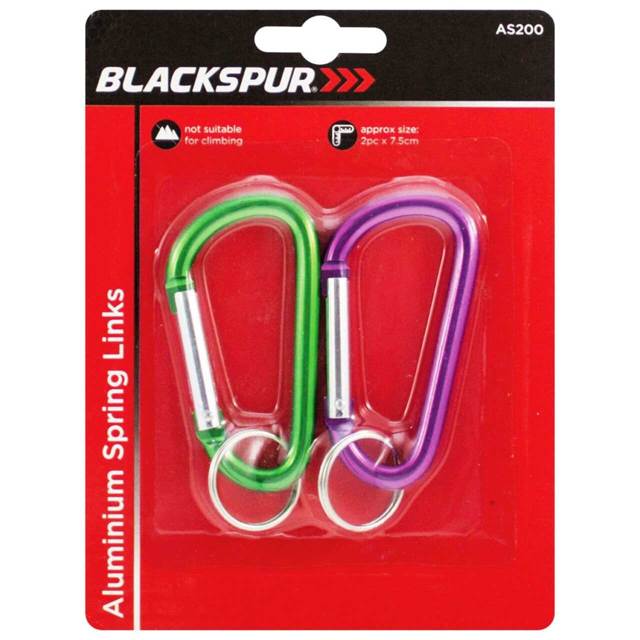 Blackspur Set of 2 Aluminium Carabiner Spring Links are suitable for a variety of uses such as a keyring, or to clip onto and hang lightweight items. Each hook is made from aluminium and has an anodized finish. A spring loaded gate keeps items secure on clip. Set consists of two different colours.
